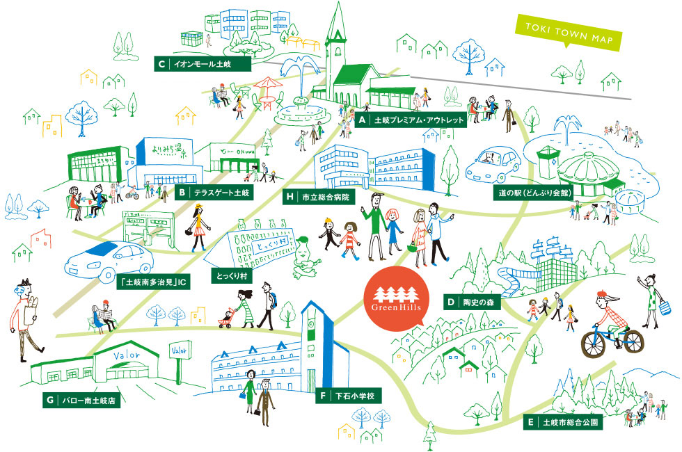 ※イラストはイメージです。(仮称)イオンモール土岐の完成予想図はイメージCGです。各施設への距離は現地からの道路距離の概測で、徒歩時間は80mを1分で換算したものです。車での所要時間は一般道は時速40km、高速道路は時速100kmで換算。また、信号待ちや渋滞等で時間が変動する場合がございます。予めご了承下さい。